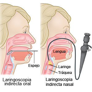 - En la laringoscopia indirecta, se usa un pequeño espejo sostenido en la parte posterior de la garganta. El médico proyecta una luz sobre el espejo para ver el área de la garganta. Este procedimiento simple y rápido casi siempre se hace en el consultorio médico mientras usted está despierto. Se puede emplear un medicamento para insensibilizar la parte posterior de la garganta.